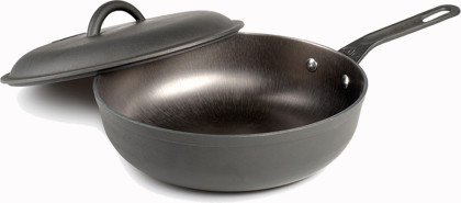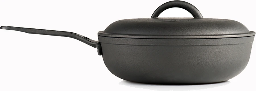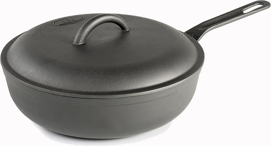 GSI Guidecast Frying Deep Pan: litinová pánev s poklicí vhodná pro všechny typy povrchů, snadno s ní uvaříte v kempu na přímém ohni i doma na indukci. Výhodou je nízká hmotnost, která je o 20-40% nižší než běžně prodávané litinové pánve.