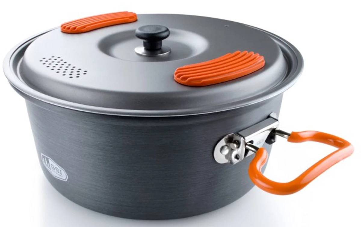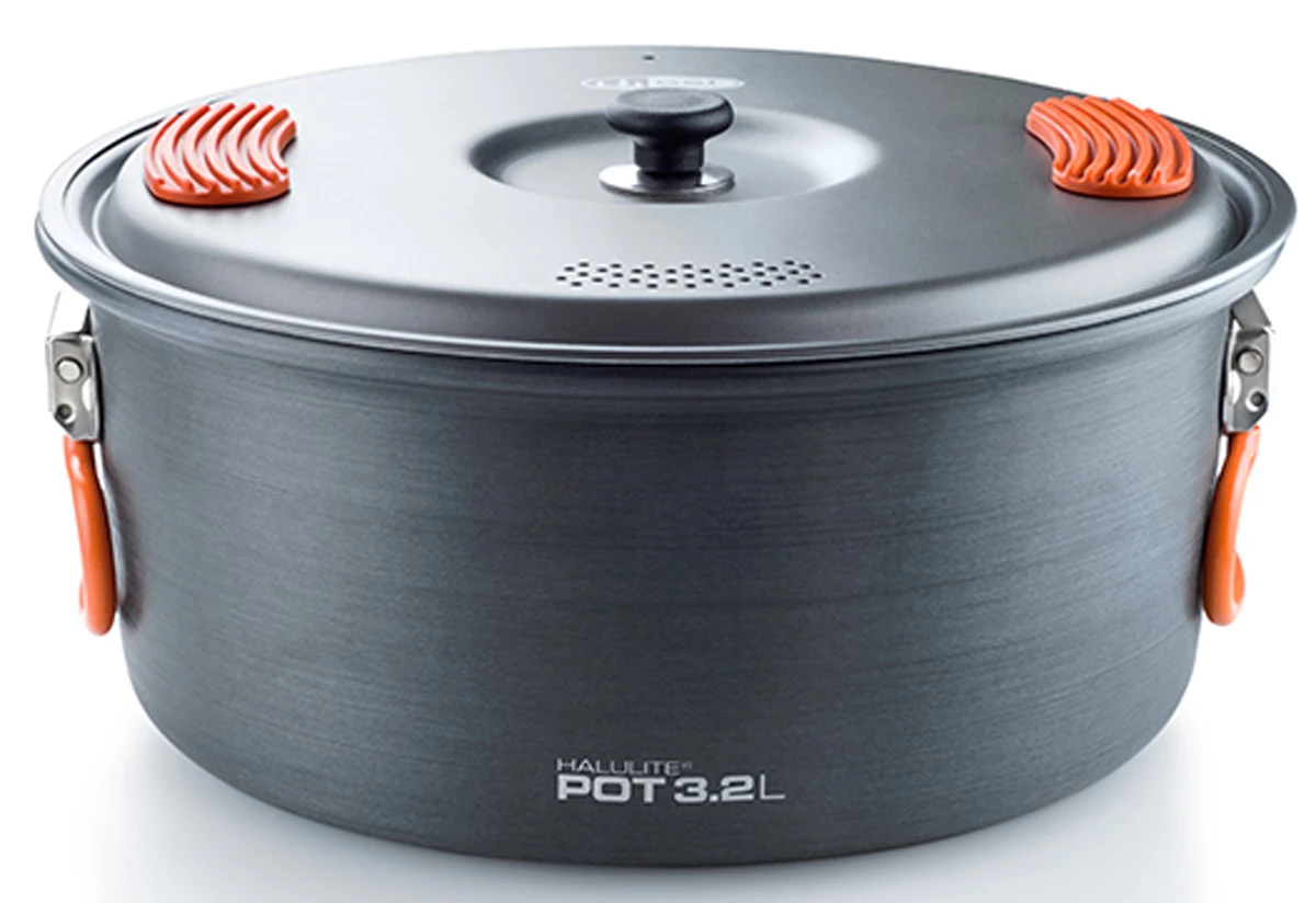 GSI Halulite 3,2 L Pot: je rozměrný rodinný kotlík o objemu 3,2 litrů. Je vhodný pro stanování, ale i na chatu. Má sklopné rukojeti a pokličku s otvory pro slití vody. Rukojeti i poklička jsou opatřeny ochranou proti popálení. Praktické je vroubkované dno, díky kterému hrnec neklouže na vařiči. Kotlík je vyrobený z odolného hliníku, který má odolnou povrchovou úpravu Halulite, která zabrání kontaktu hliníku s potravinami. Přibližuje se houževnatostí eloxu proti poškrábání a odření titanu, ale oproti titanu si zachovává výborné vlastnosti při vedení tepla, a tím zkracuje dobu vaření a šetří tak palivo.