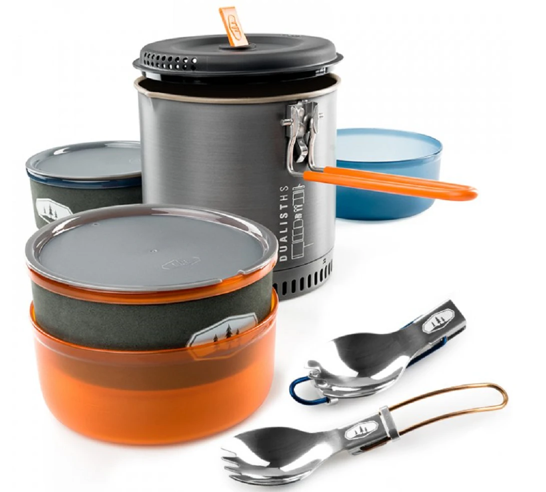 Halulite Dualist HS: je sada nádobí pro 2 osoby s hlavním 1,8l rendlíkem z tvrdě eloxovaného hliníku. Na spodní části rendlíku je hliníkové žebrování - tepelný výměník, který zkracuje dobu ohřevu o 30% a zároveň šetří plyn. Součástí sady jsou 2 misky, 2 hrnky s děrovaným víkem pro pití, 2 skládací lžícovidličky, perforovaná poklička pro scezení vody a obal na celou sadu, který slouží jako nádoba na vodu nebo umyvadlo. Celá sada se dá do hlavního rendlíku složit tak šikovně, že zbyde místo i pro plynovou kartuši GSI Isobutane Fuel 230 g a plynový vařič GSI Pinnacle Canister Stove, které však nejsou součástí sady.