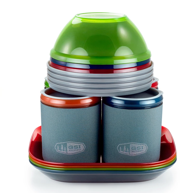 GSI Infinity 4 Person Deluxe Tableset, Multicolor: Sada nádobí pro 4 osoby vhodná pro cestovatele a příznivce kempování. Sada obsahuje 4 komplety rozlišené pestrými barvami, které se dají jednoduše složit do sebe. Veškeré nádobí je vyrobené ze 100 % recyklovatelného materiálu, který je zároveň BPA FREE . Hrnky jsou izolované pěnou a udrží tak nápoj déle teplý a umožňuje ho i komfortně držet v ruce. Misky s víčkem umožňují uchovávání potravin.