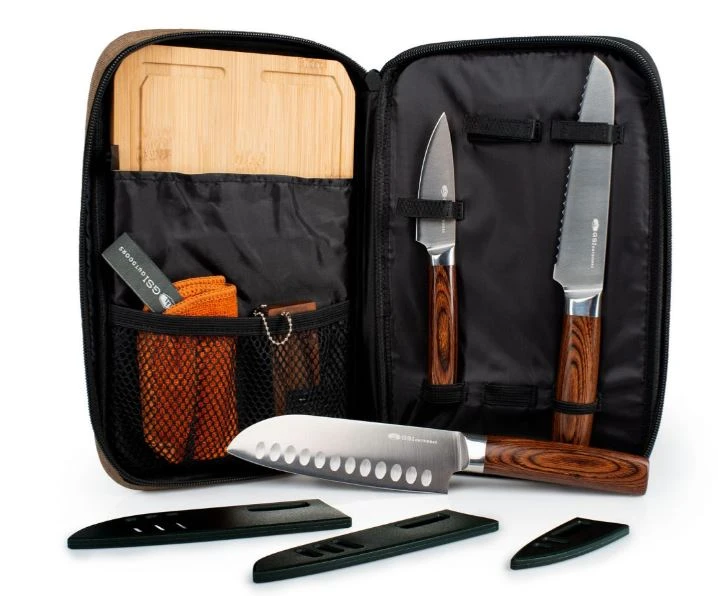 GSI Outdoors Rakau Knife set: je cestovní set nožů pro gurmány, který využijete v kempu na dovolené. Set obsahuje bambusové prkénko se žlábkem na šťávu, ručník z recyklovaného mikrovlákna, lahev na mýdlo nebo saponát a 3 ks mistrovsky vyrobených nožů s nerezovou čepelí a vodotěsnými dřevěnými laminátovými rukojeťmi.