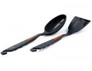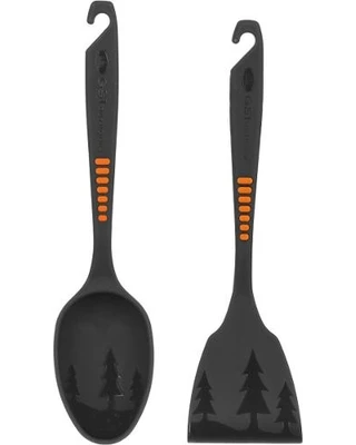Lžíce a špachtle GSI Pack Spoon / Spatula set: je lehké a odolné kuchyňské náčiní pro kempování. Je opatřené silikonovými úchytkami. Nářadí je vyrobeno z vysokým teplotám odolného Nylonu 6–6. Háčky umožňují zavěšení tohoto nádobí třeba na provázek.