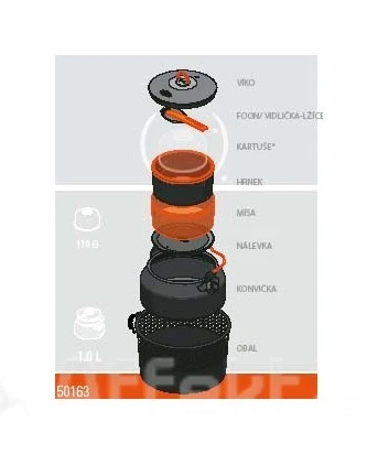 Sada GSI Outdoors Halulite Ketalist obsahuje konvičku, hrneček a mističku, vidličku / lžíci / a víčko / pokličku/ pro jednu osobu. Hrneček a mistička mají nízko těžiště. Do sady lze umístit také plynovou kartuši 110g.