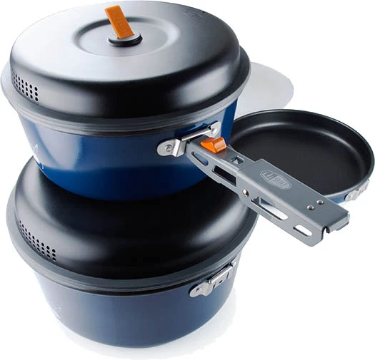 GSI Bugaboo Base Camper Medium : outdoorové nádobí pro 4 osoby na cesty a do kempů. V sadě najdete 5 hrnců, 2 pokličky , pánev a prkénko. Nádobí je potaženo kvalitní teflonovu vrstvou.