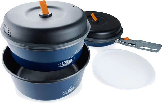 GSI Outdoors Bugaboo Base Camper Small : hliníkové kempovací nádobí potažené teflonem je určeno pro 2 osoby. Hodí se pro turistiku, kempování, se na vaření na letní dovolené, ale také na expedicích v horách. V sadě jsou 2 hrnce, 2 pokličky, 1 pánvička, 1 plastové prkénko. Obal slouží jako umyvadlo.