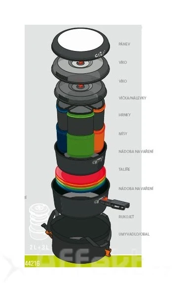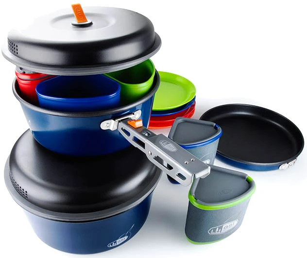 GSI Outdoors Bugaboo Camper : pro 4 osoby určené na letní dovolenou do kempu. Sada obsahuje dva hrnce, dvě pokličky, pánvičku, čtyři hrnečky, čtyři misky.