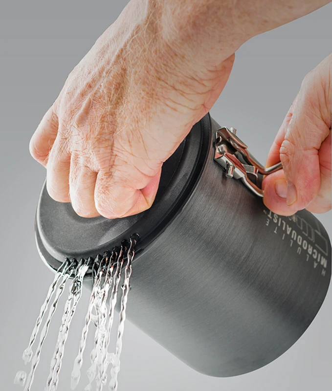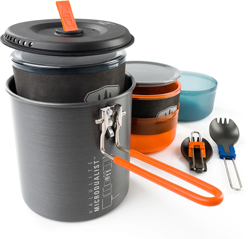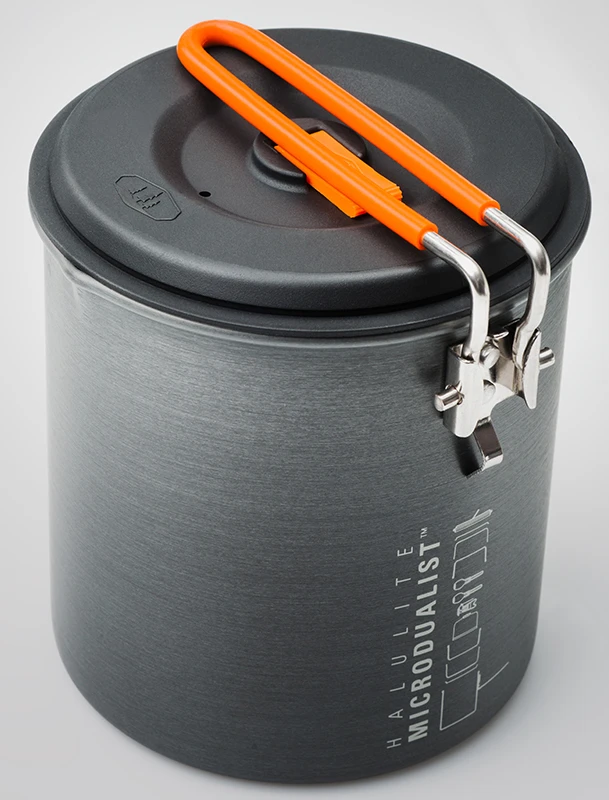 GSI Outdoors Halulite Microdualist : sada kempingového nádobí pro 2 osoby. Váha je 505 g a sada je vyrobena z eloxovaného hliníku, který zabrání kontaktu potravin s hliníkem. Výsledkem je lehké nádobí s velmi kvalitní povrchovou úpravou, která výborně odolává poškábání. Zároveň výborně distribuuje teplo.