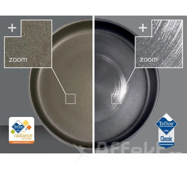 Má velmi vysokou oděruvzdorností a ohřev je o 25% rychlejší než u klasického nerezového nádobí. Teflon s radiance technologií byl vyvinutý firmou DuPont především pro kempingové nadobí. Technologie Radiance je revolucí mezi nepřilnavými povrchy kuchyňského nádobí. Tato nová technologie optimalizuje rozložení teploty při vaření více než kdykoli před tím. Technologie tří povrchů navíc zajišťuje větší odolnost proti poškrábání a opotřebení, která umožňuje použití většiny kovových nástrojů. Do sady je možné umístit vařič i jídelní příbory.