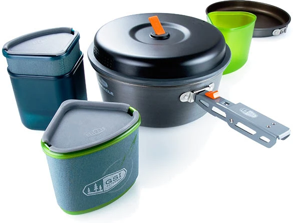 Sada kempingového nádobí GSI Outdoors Pinnacle Backpacker : vyrobené pro vaření dvou osob je ideální na turistiku, kempování, vodácké sporty. Sada GSI Pinnacle Bacpacker je poměrně rozsáhlá sada pro všemožné vaření a váží 790 g. Obsahuje: 2 l kastrol, 2 pokličky, 203 mm pánev, 2* 400 ml termo hrneček s víčkem/pítkem. 2* 400 ml miska, pokličku.
