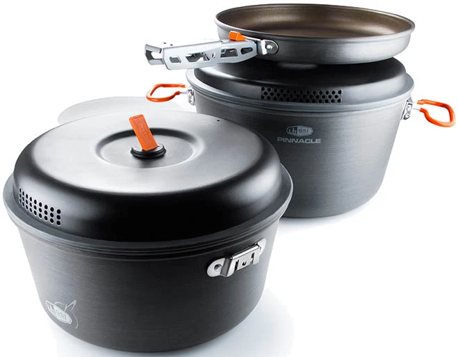 GSI Outdoors Pinnacle Base Camper Large : je rozsáhlá sada pro delší kempování pro 4 a více osob. Umožní vám pohodlné vaření v kempech pro celou rodinu. Sada nádobí pro kempování obsahuje 2 velké hrnce s pokličkami a pánev s kvalitní teflonovou vrstvou s vysokou oděruvzdorností. Nechybí prkénko a obal, který slouží jako dřez.