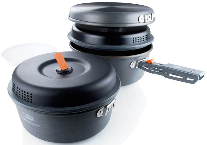 GSI Outdoors Pinnacle Base Camper Small : kempingové nádobí vhodné pro 2–3 osoby. Toto nádobí je ideální pro cyklisty, vodáky, turisty,alpinisté atp. V sadě jsou 2 hrnce s pokličkami, pánev a prkénko .