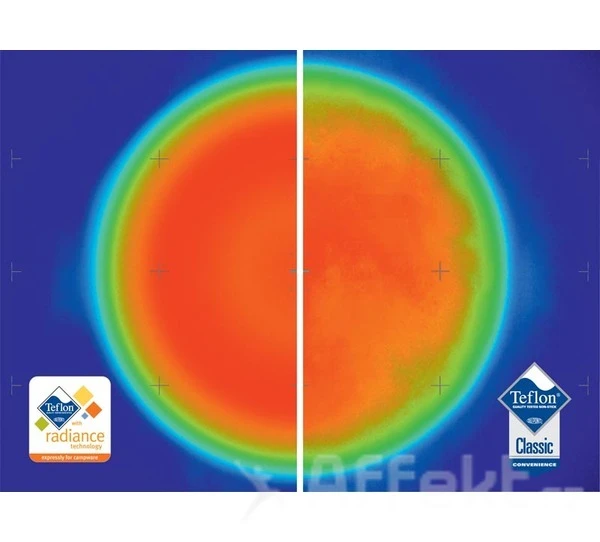 Vyznačuje se skvělou distribucí tepla, velmi vysokou oděruvzdorností a ohřev je o 25% rychlejší než u klasického nerezového nádobí. Teflon s radiance technologií byl vyvinutý firmou DuPont především pro kempingové nadobí. Technologie Radiance je revolucí mezi nepřilnavými povrchy kuchyňského nádobí. Tato nová technologie optimalizuje rozložení teploty při vaření více než kdykoli před tím. Technologie tří povrchů navíc zajišťuje větší odolnost proti poškrábání a opotřebení, která umožňuje použití většiny kovových nástrojů
