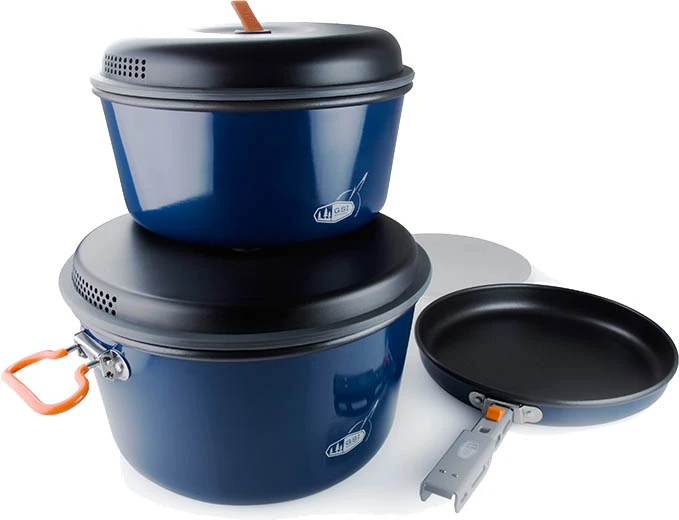 GSI Bugaboo Base Camper Large : je rodinná sada outdoorového nádobí pro 4 osoby. Obsahuje 2 velké hrnce (5l a 3 l) s pokličkami, pánev a prkénko. Hrnce mají izolovaná ucha, takže se při vaření nepopálíte o horké nádobí. Povrch nádobí je chráněn úpravou Bugaboo, což je vynikající poměr užitných vlastností a ceny.