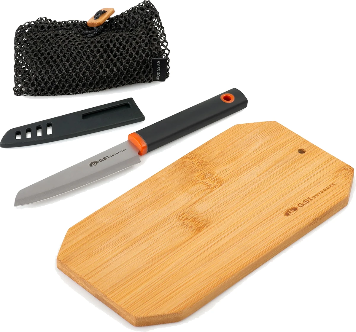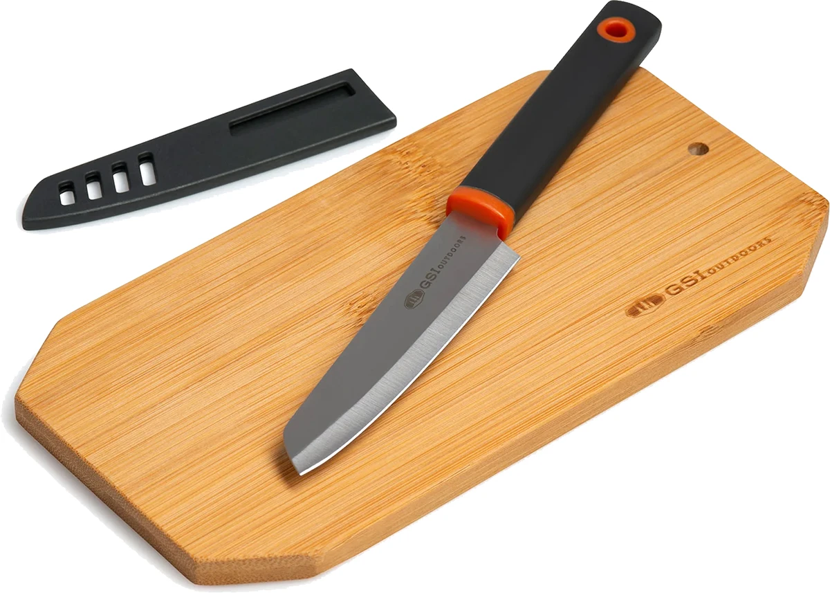 GSI Santoku Set: je cestovní set nože a bambusového prkénka který využijete v kempu na dovolené. Nůž je vyrobený z nerezové oceli. Rukojeť je z příjemného materiálu pro komfortní a bezpečné uchopení. Nechybí ochranný bezpečnostní obal.