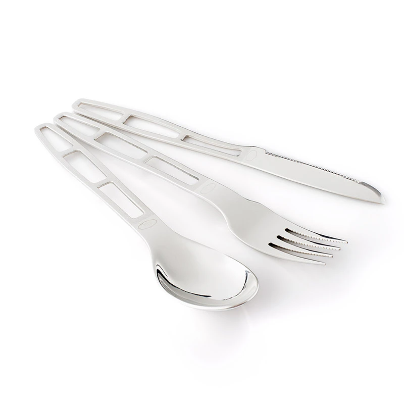 GSI Stainless 3 pc. Cutlery Set: Příborový set z kvalitní, a velmi pevné nerezové oceli. Skládá se z příborového nože, vidličky a lžíce. Je velice lehký a praktický, proto se velice dobře hodí do kempu, na túru nebo na chatu.