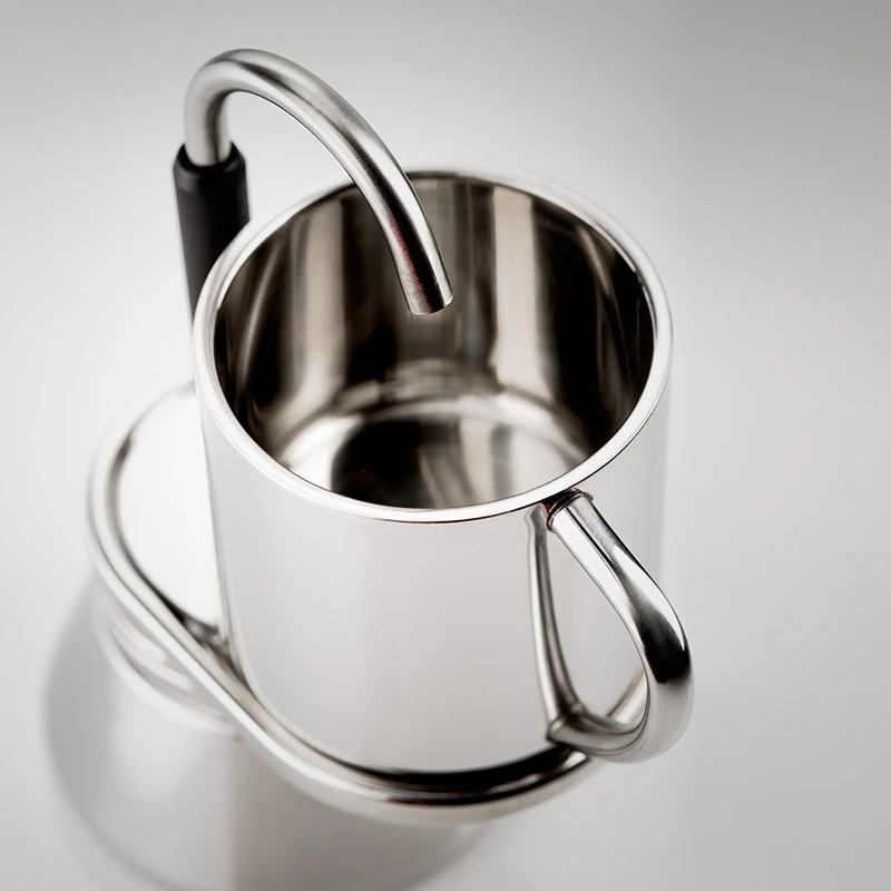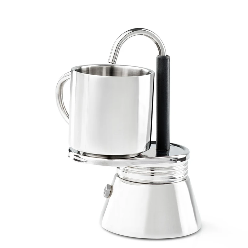 Je to klasická moka konvička, kam dáte vodu, na ní sítko s kávou a začnete vařit. Během varu se voda tlakem dostane přes namletou kávu a ta už natéká do hrnečku, který má velikost jednoho malého šálku kávy.