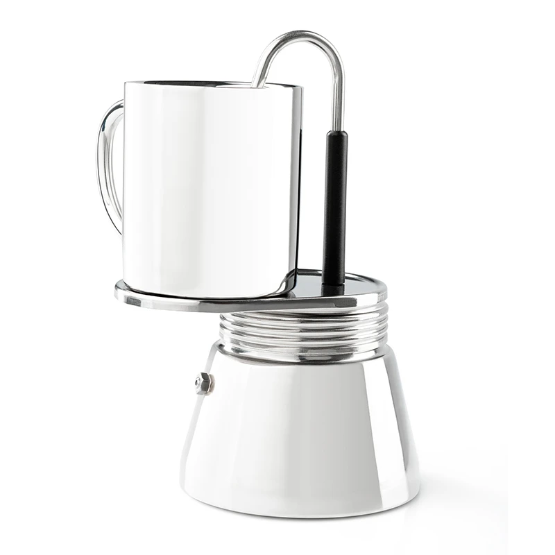 Je to klasická moka konvička, kam dáte vodu, na ní sítko s kávou a začnete vařit. Během varu se voda tlakem dostane přes namletou kávu a ta už natéká do hrnečku, který má velikost čtyř malých šálků kávy.