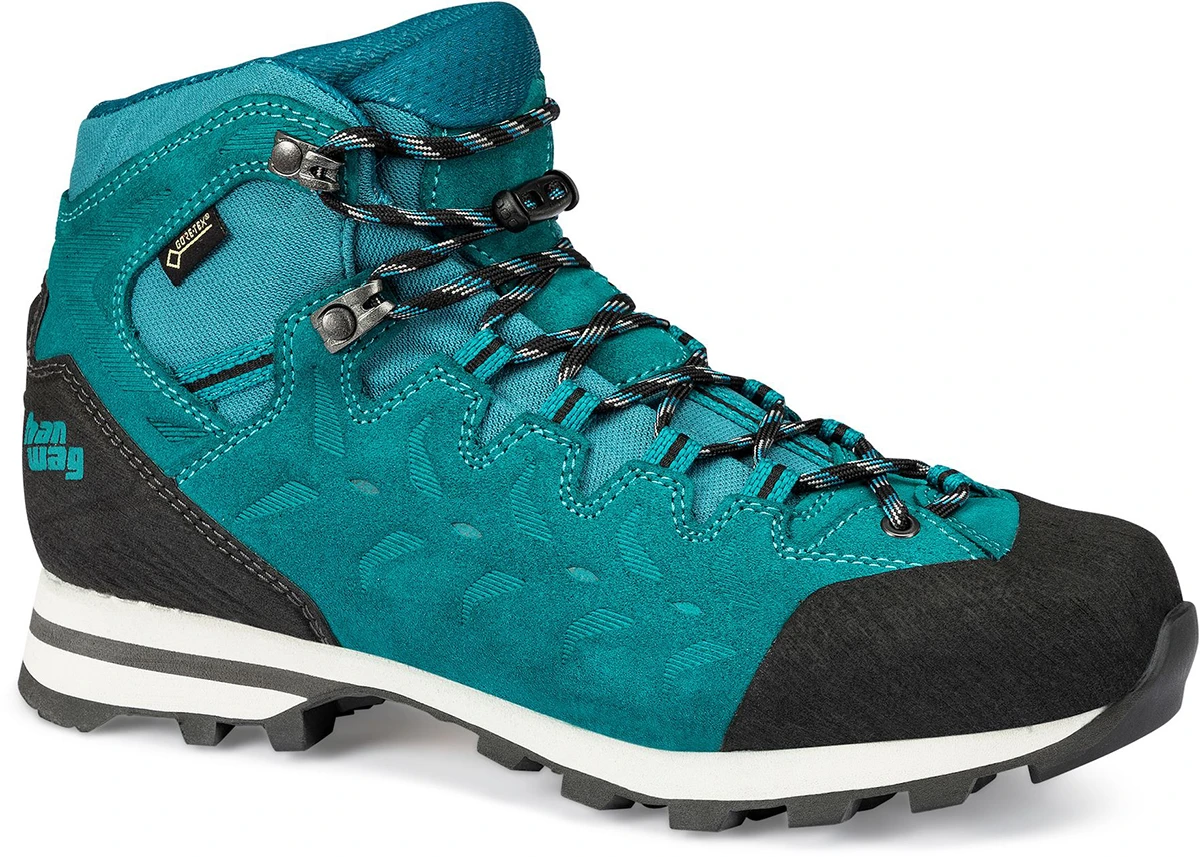 Hanwag Makra Light Lady GTX - jsou všestranné dámské kotníkové boty určené pro vysokohorskou turistiku, nebo pro lezení ferrat. Boty mají GORE-TEX membránu, jsou voděodolné a zároveň prodyšné. Podrážka Vibram pro lepší přilnavost. Dvouzónový systém šněrování, který neklouže a drží, se dobře přizpůsobí danému terénu. Boty jsou vyrobeny z semišové kůže a textilie, mají výztuhu z TPU v přední části. Střední střih, polstrování v oblasti kotníku.