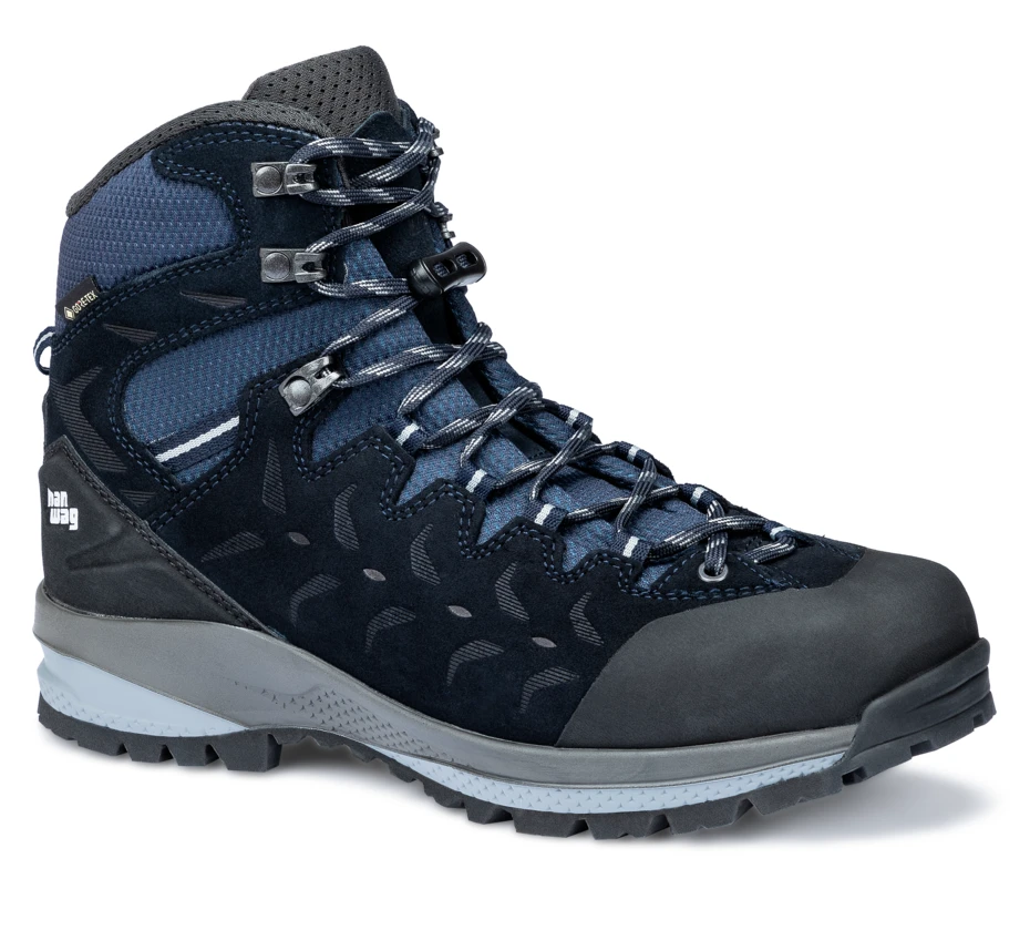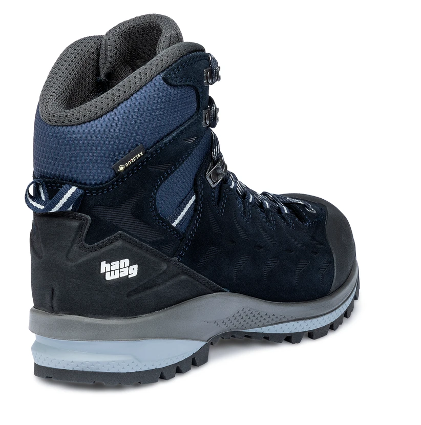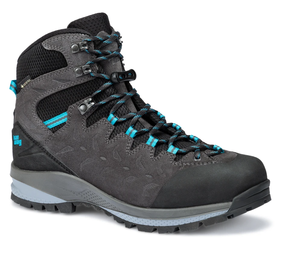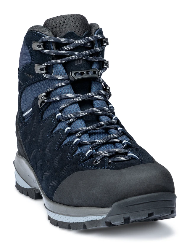 Hanwag Makra Trek SF Extra Lady GTX - jsou dámské kotníkové boty, s lehkou a velmi pohodlnou konstrukcí podrážky. Boty jsou určené pro širší chodidla. Jsou ideální volbou pro delší túry a vícedenní túry s těžkým batohem. Boty mají GORE-TEX membránu, jsou voděodolné a zároveň prodyšné. Podrážka Vibram Trekking SF se širokou kontaktní plochou zajišťuje pevnost a stabilitu.. Hanwag 2 Zone Lock s mechanickým šněrovacím zámkem zlepšuje padnutí na patě. Na rozdíl od běžných upínacích háčků na tkaničky zůstává mechanický zámek tkaniček na místě a nemůže sklouznout. Boty jsou vyrobeny z semišové kůže a textilie.