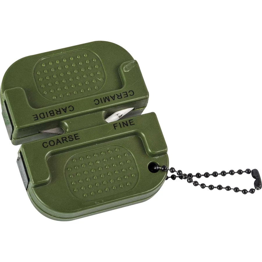 Brousek má dvě brusné plochy: karbidová pro hrubé broušení a keramická pro jemné dobroušení ostří. Zkřížené brusné plochy zaručují přesný a všude stejný úhel ostří. Dále zde najdete: gumové dorazy proti klouzání, úchyty na obou stranách pro pohodlné držení a řetízek pro zavěšení na batoh.