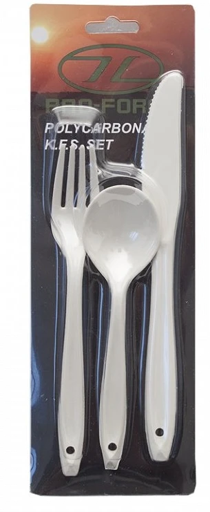 HIGHLANDER Polycarbonate KFS Příborový set: Lehký příborový set vyrobený z polykarbonu. Sada obsahuje příborový nůž, vidličku a lžíci. Na konci rukojeti najdete otvor pro sepnutí a upevnění příboru k sobě, nebo k batohu. Díky použitému materiálu je příbor zdravotně nezávadný, krátkodobě odolá teplotě 120°C, a je šetrný k teflonovému nádobí.