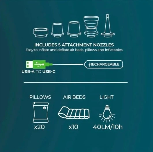 Pumpička Wee Banshee je na jedno nabití schopná nafouknout až 20 vzduchových polštářků, 10 nafukovacích karimatek nebo svítit při 40 lumenech po dobu 10 hodin.