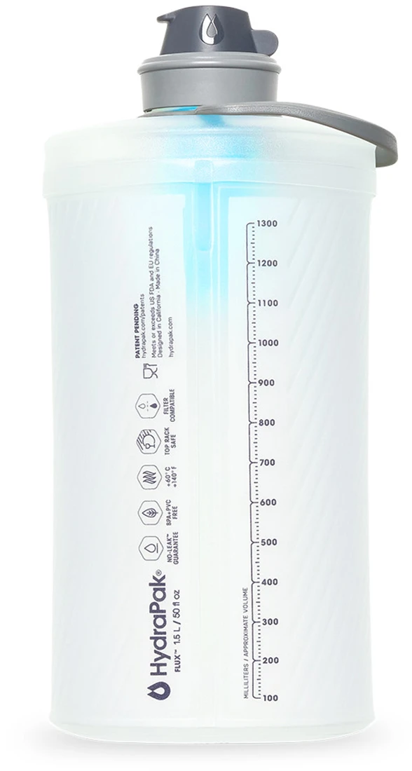 HydraPack Flux+ 1,5 l: skládací láhev o objemu 1,5 litrů s filtrem, který zbaví vodu škodlivých bakterií a prvoků. Láhev je lehká a měkká, po vyprázdnění ji snadno sbalíte na velikost do kapsy. Je vyrobena z dvoustěnného TPU materiálu díky tomu po naplnění drží tvar a samostatně stojí jako běžná láhev. Lze snadno otevřít i zavřít jednou rukou.