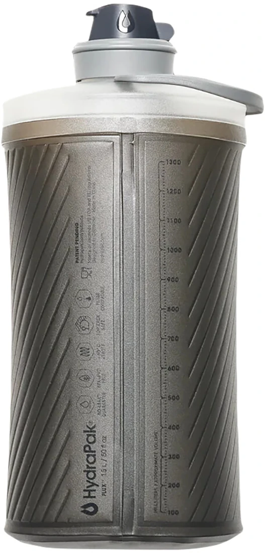 HydraPack Flux 1,5 l: skládací láhev o objemu 1,5 litrů. Láhev je lehká a měkká, po vyprázdnění ji snadno sbalíte na velikost do kapsy. Je vyrobena z dvoustěnného TPU materiálu díky tomu po naplnění drží tvar a samostatně stojí jako běžná láhev. Lze snadno otevřít i zavřít jednou rukou.