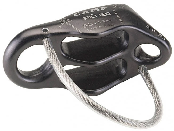 Camp Piu 2 – klasický jistící kýbl pro jednoduchá i dvojitá lana. Jeho výhodou je, že nekroutí lana jako osma a má dobré brzdné síly.