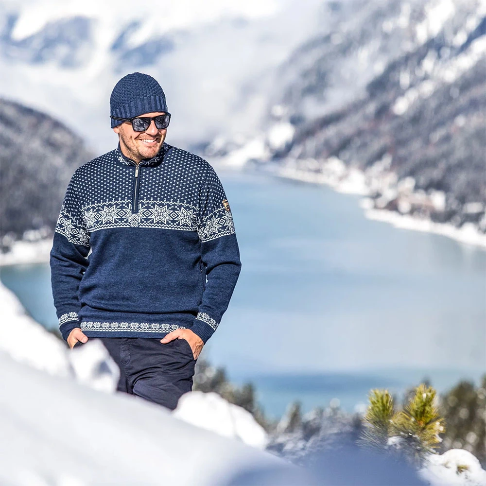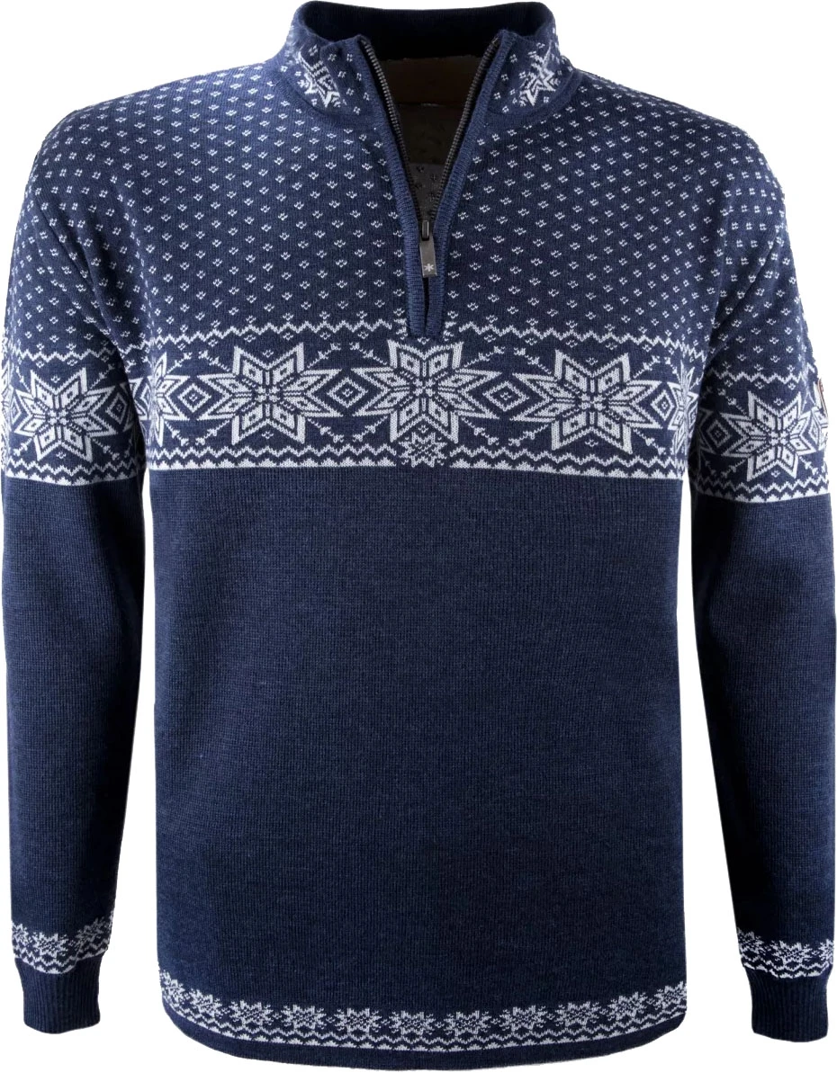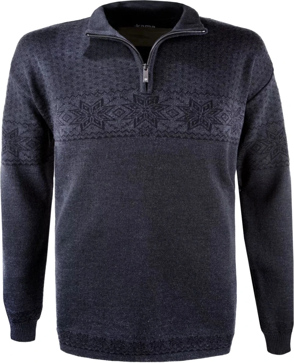 Kama 4053: svetr s jemným severským vzorem, stojáčkem a s rozepínáním u krku. Pletený svetr je z úpletu ze 100% vlny Merino, je prodyšný a velmi příjemný na nošení. Navíc má nano úpravu vlny proti nasákávání vlhkosti. Hodí se jako druhá vrstva do města i do přírody.