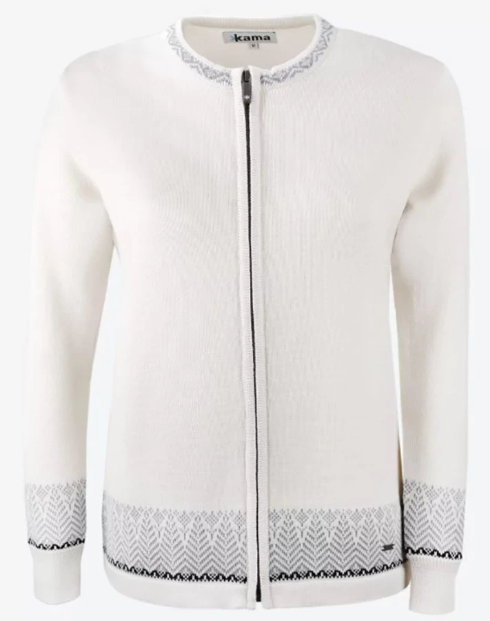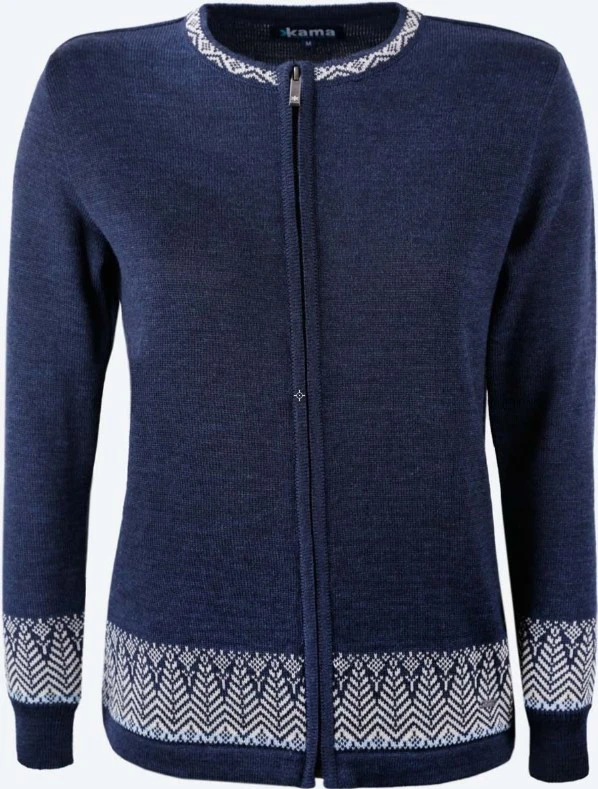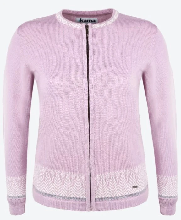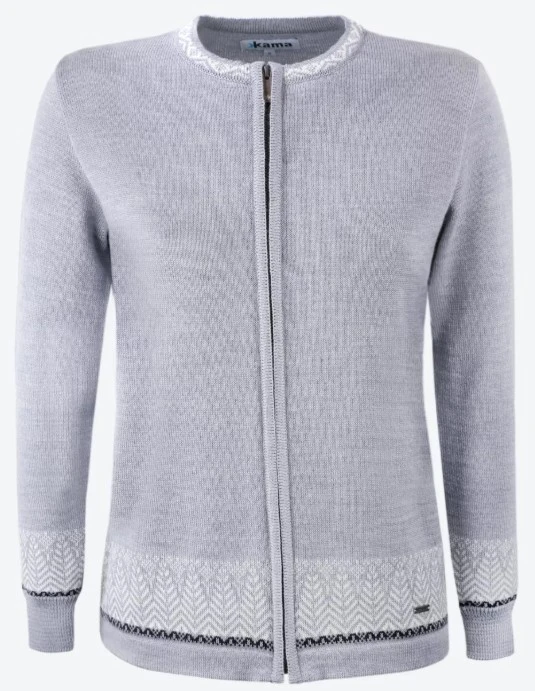 Kama 5023 – dámský svetr vyrobený ze 100% Merino vlny. Svetr je dámského střihu s dlouhým zipem a jemným motivem v dolní části těla a rukávů. Svetr je tenký, dostatečně lehký a příjemný na nošení, vhodný pro alergiky, neabsorbuje pachy. Svetr se hodí do města i do kanceláře.