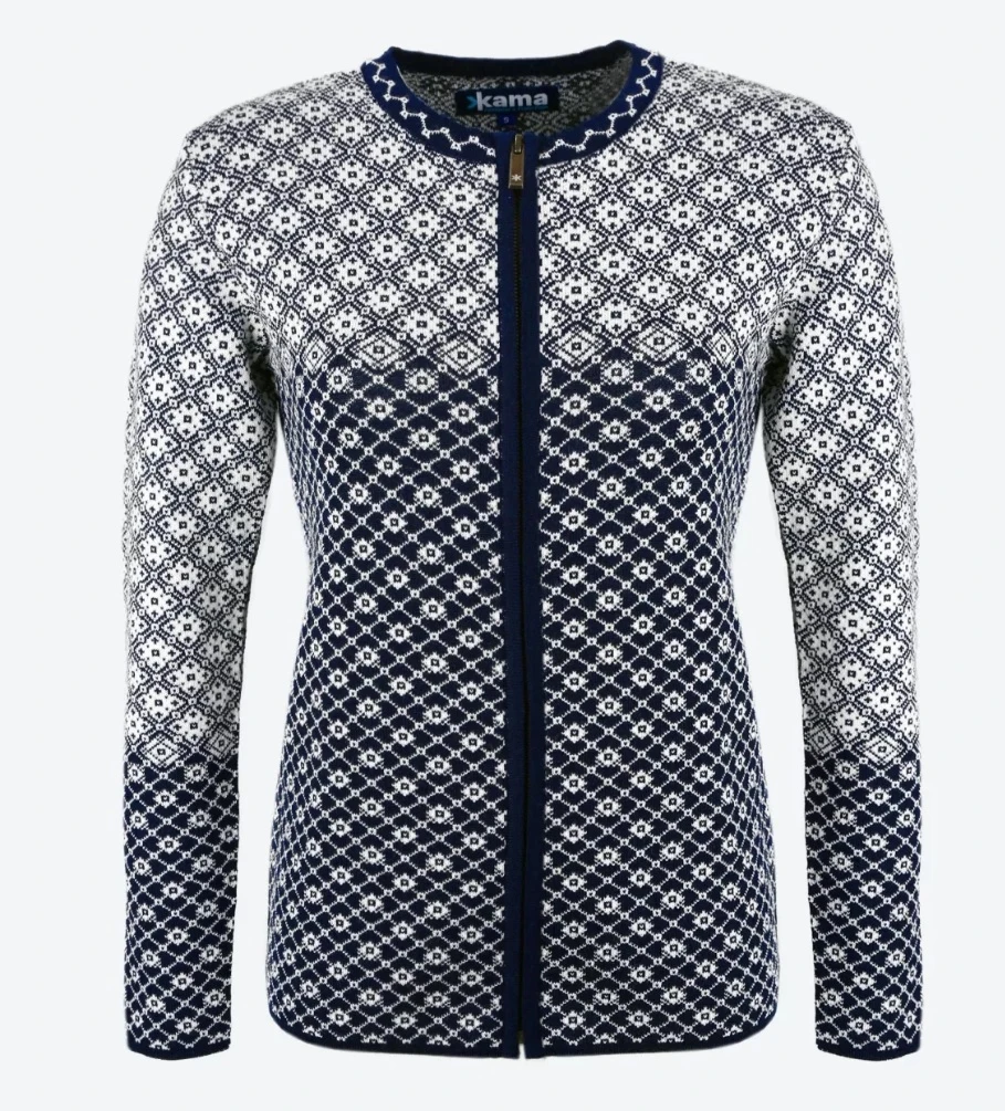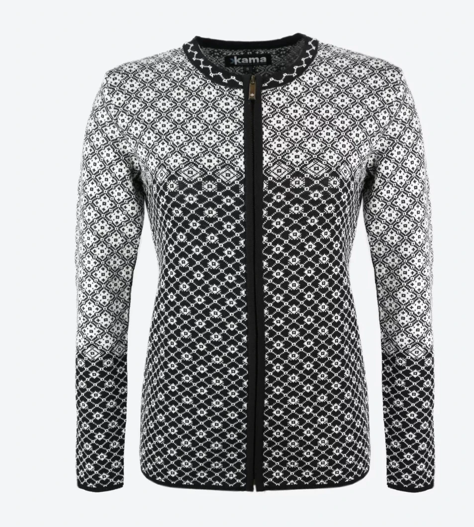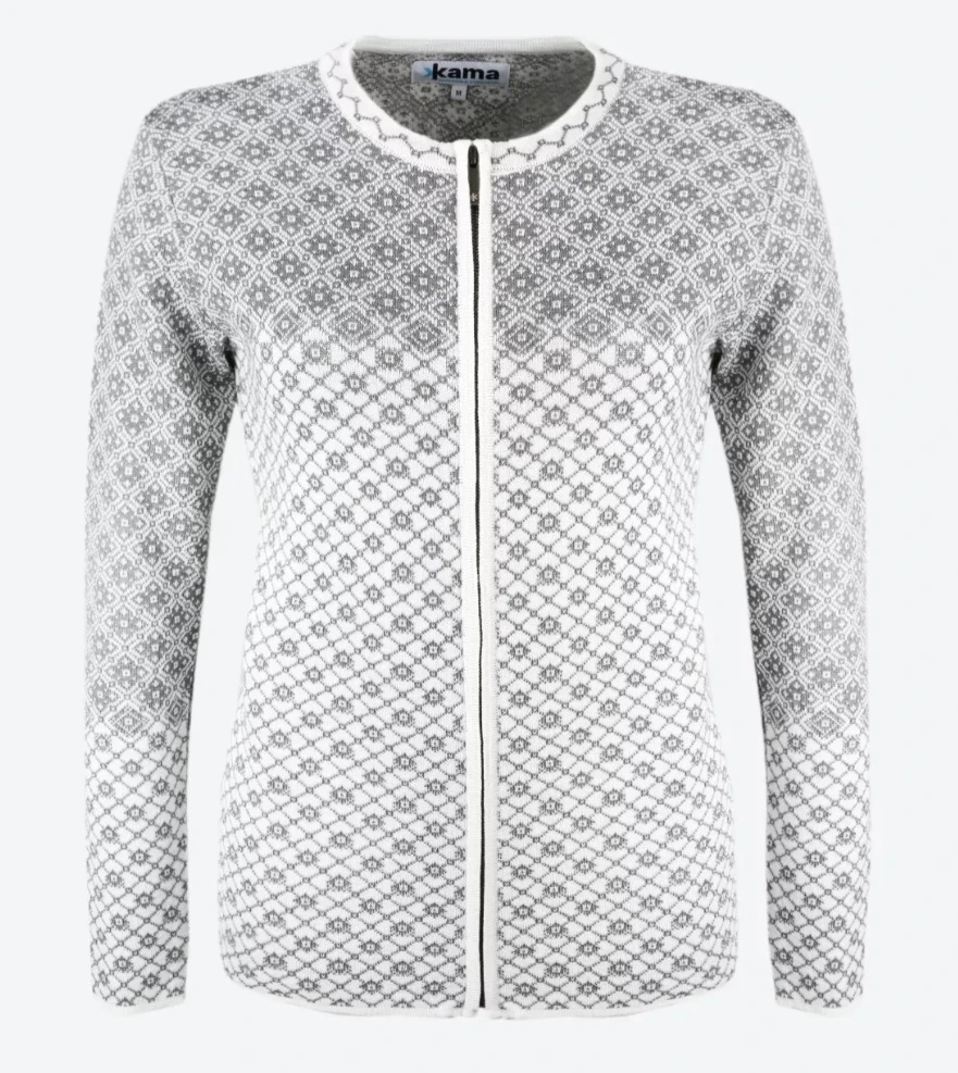 Kama 5036: Módní dámský celorozepínací svetr. Jedná se o vkusný doplněk na každý den do hor, i do města. Zaujme svými dlouhými rukávy, nízkým stojáčkem, a stylovým pleteným vzorem. Hodí se k sukni, i ke kalhotám. Je vyrobený z kvalitní příze Schoeller 50% Merino vlna 50% akryl.