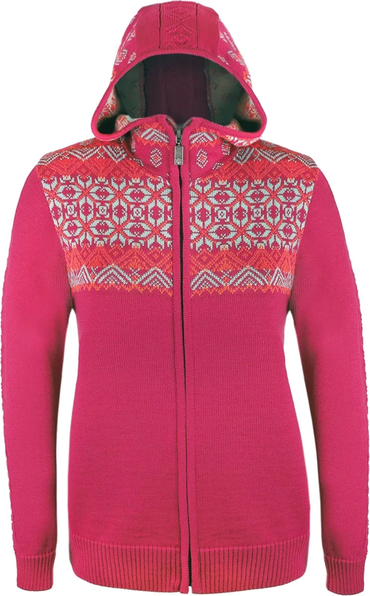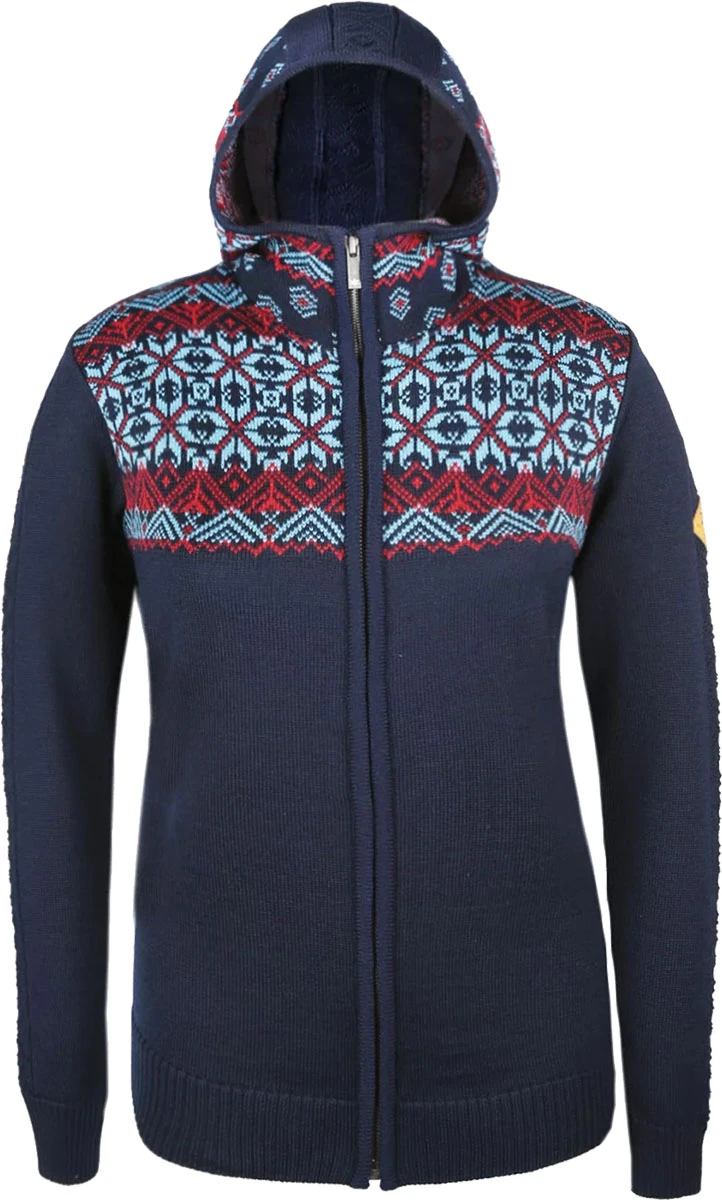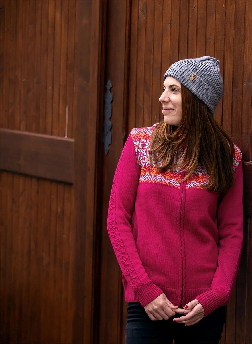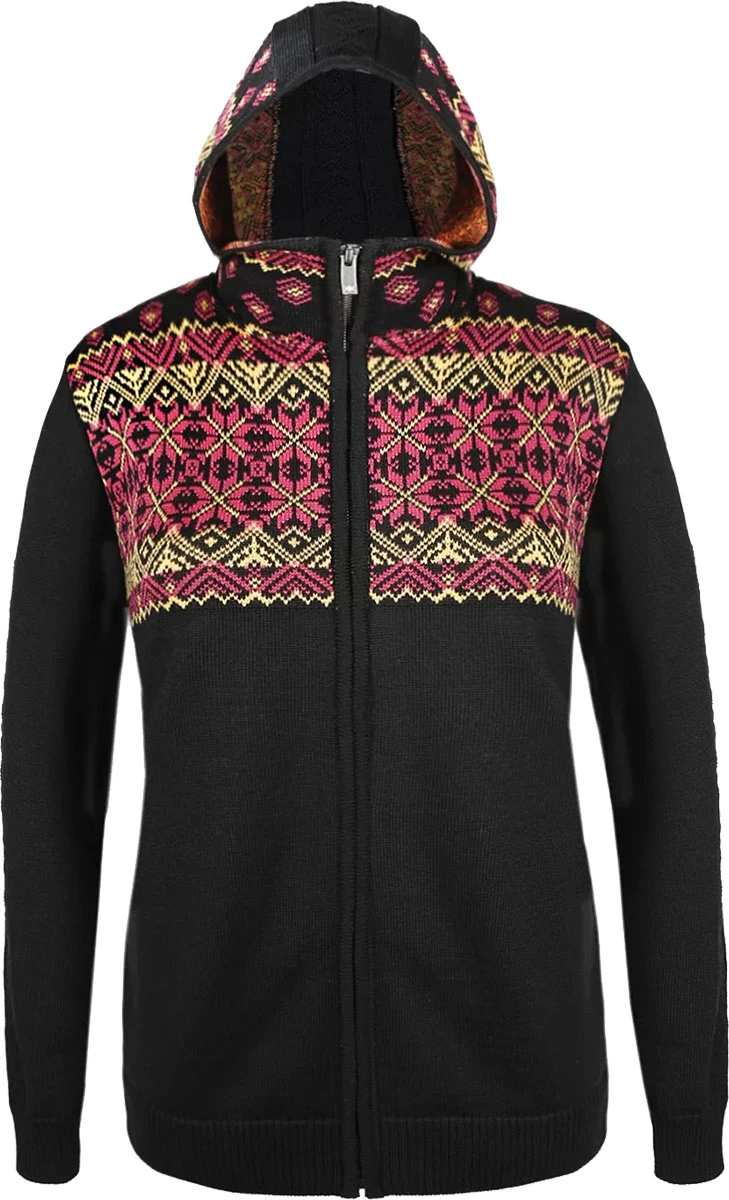 Kama 5037: dámský pletený svetr s barevným vzorem. Má dlouhý zip a kapuci, dále je ozdobený plastickým vzorem na rukávech a uprostřed kapuce. Svetr je upletený z kvalitní směsové příze Schoeller (50% Merino vlna 50% akryl). Je lehký a příjemný na nošení, vhodný pro alergiky, neabsorbuje pachy. Vyrobeno v ČR.