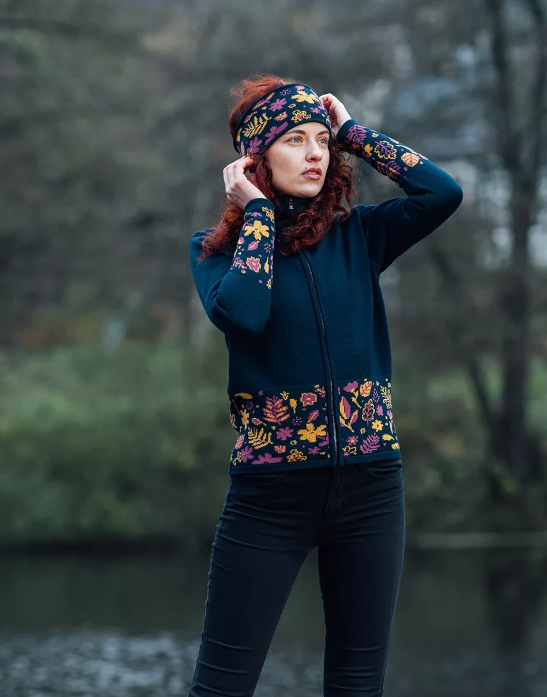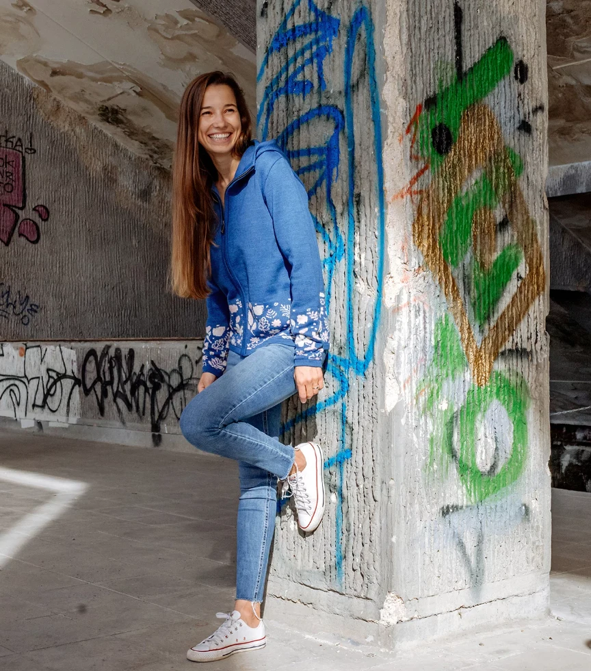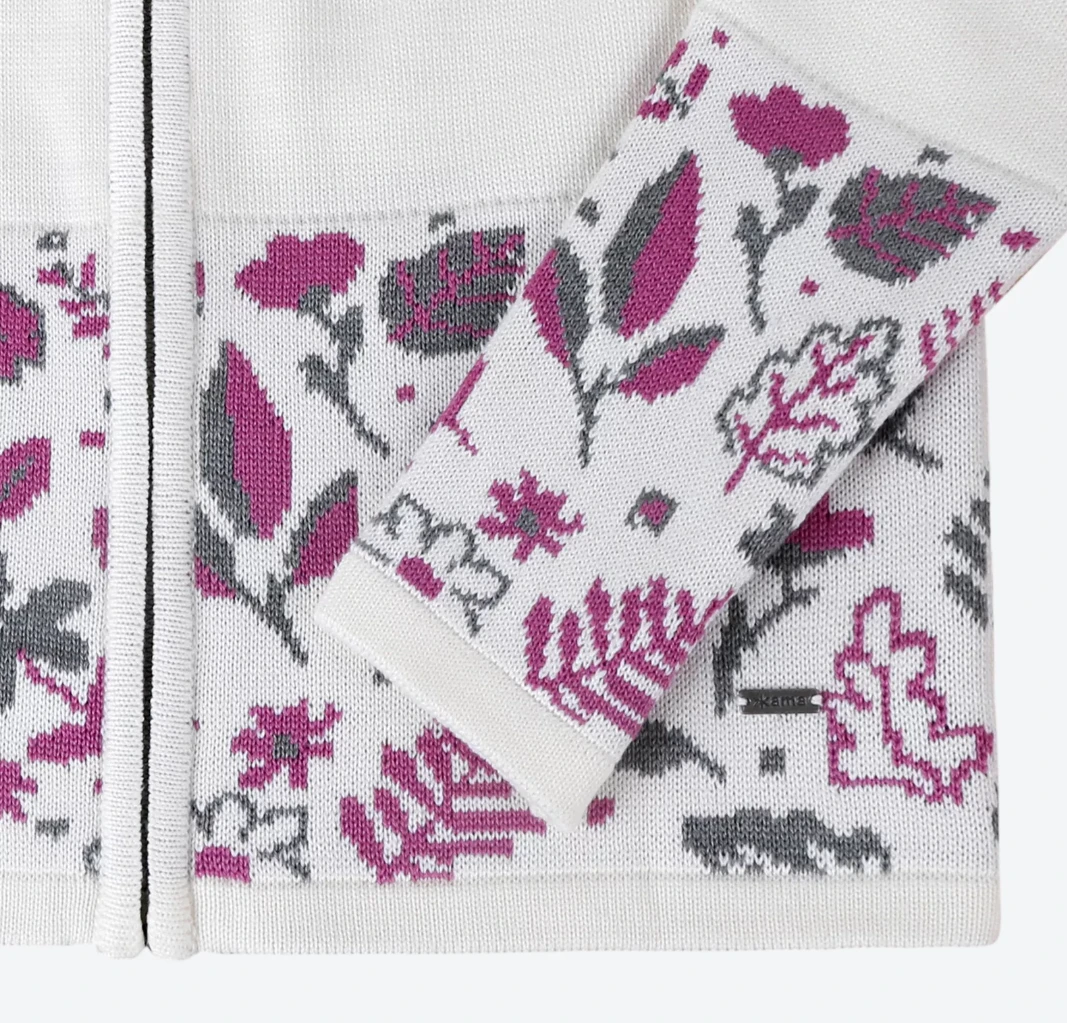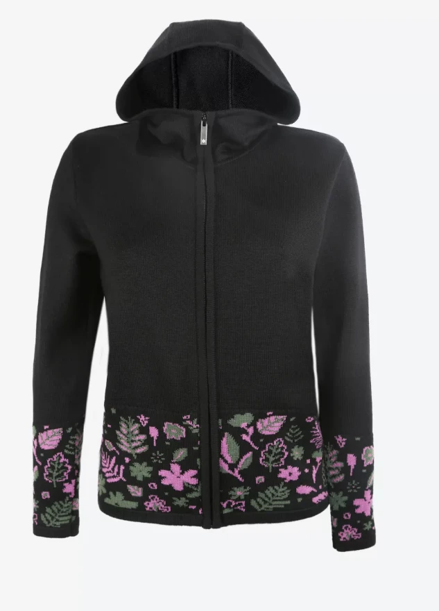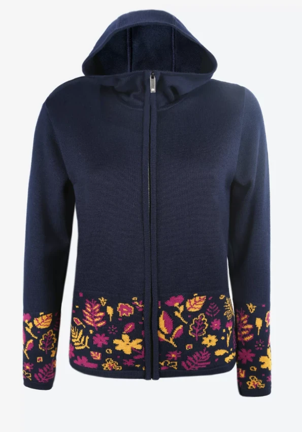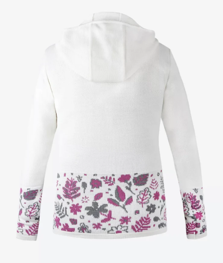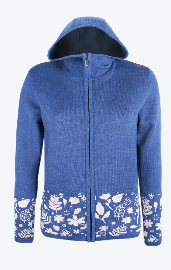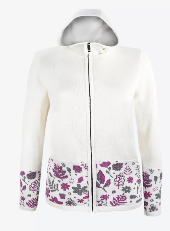 Kama 5049: osobitý dámský svetr s kapucí zdobí květinový motiv u spodního okraje těla a rukávů. Je středně teplý a hodí se k běžnému nošení.
