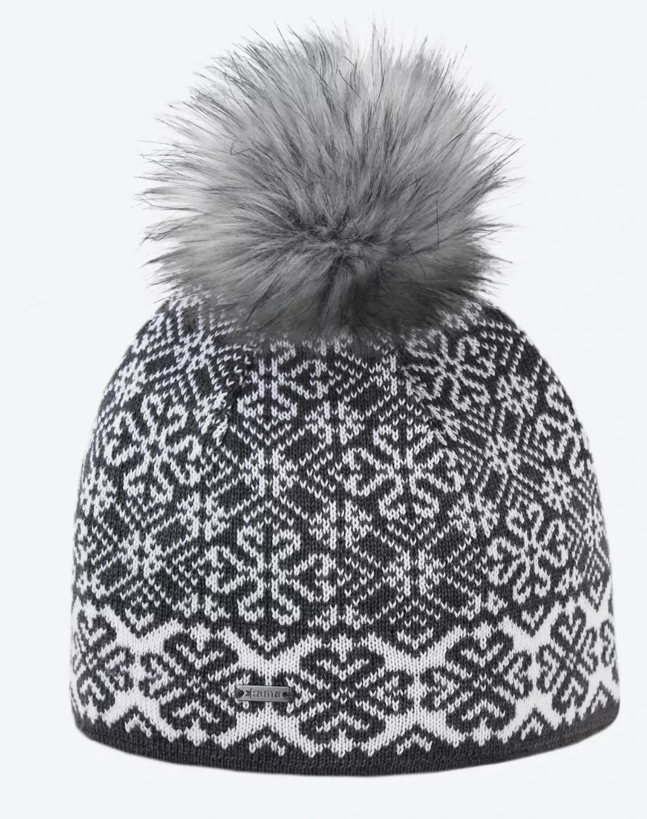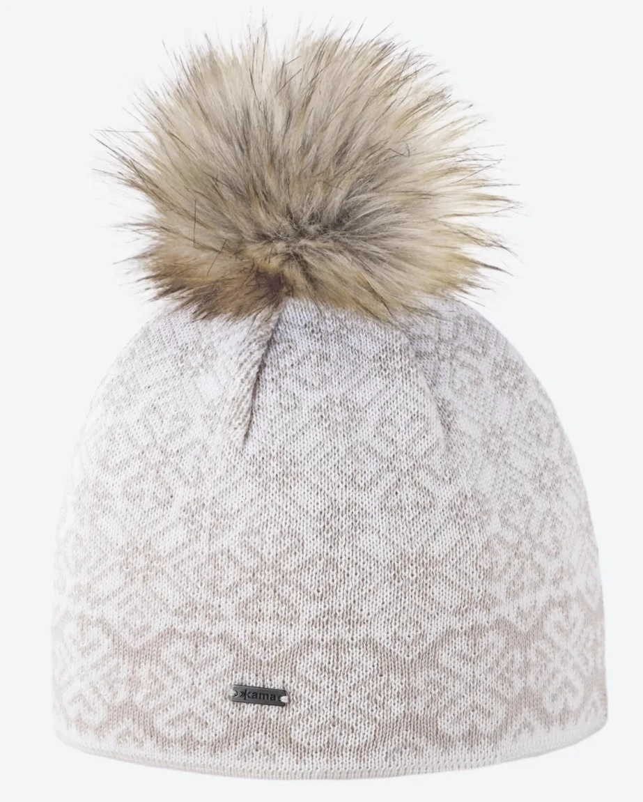 Kama A173: Elegantní dámská čepice s designovým vzorem a bambulí z umělé kožešiny. Uvnitř je podšita pruhem jemného fleecu Tecnopile, který je hřejivý a zároveň pohodlný na nošení. Čepice je vyrobena z materiálu Schoeller 50% Merino vlna a 50% akryl.