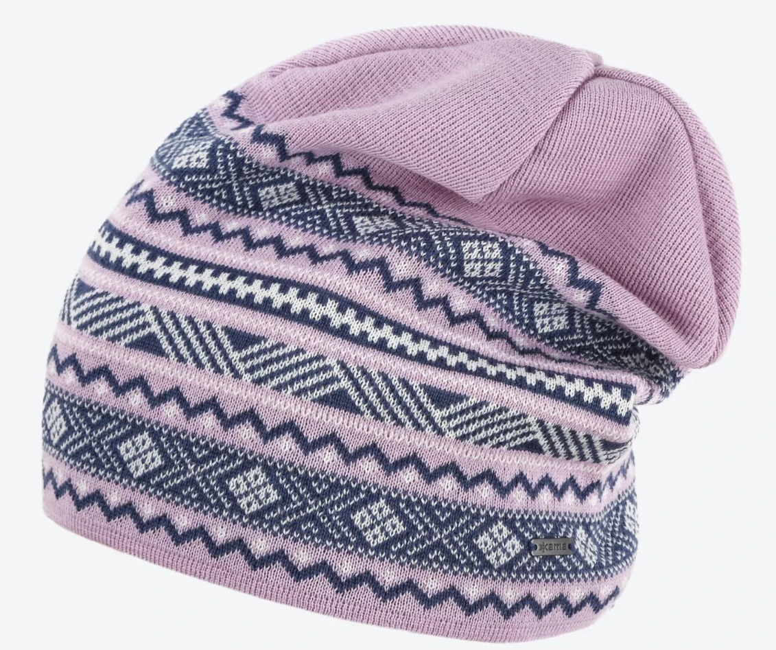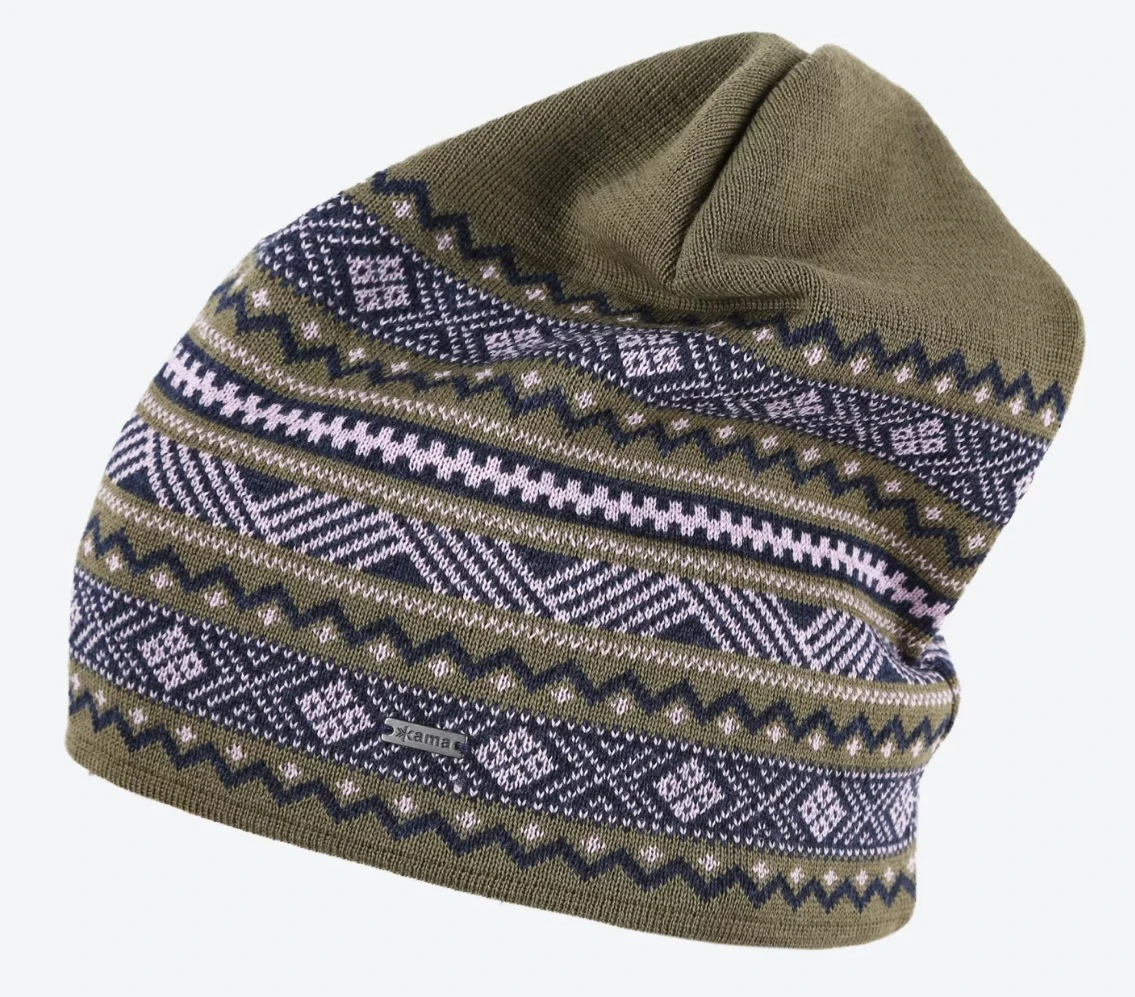 Kama A175: Dámská pletená čepice ze 100% Merino vlny. Uvnitř najdete příjemnou podšívku z hydrofobního materiálu Polycolon, který rychle odvádí vlhkost, hřeje a nedráždí. Čepice má jemný a stylový geometrický vzor, který jí v kombinaci s barevným provedením dodává módní severský vzhled.
