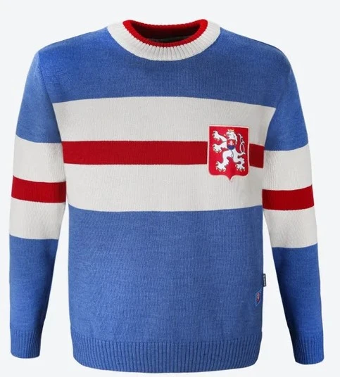 Kama Svetr ČSR - MS 1947 malý znak: Retro dres československého hokejového týmu z MS 1947 s menším znakem na srdci. Je vyrobený ze 50% Merino vlna 50% akryl. Tento svetr je vzpomínkou na první zlatý úspěch československého hokeje v mezinárodním měřítku.