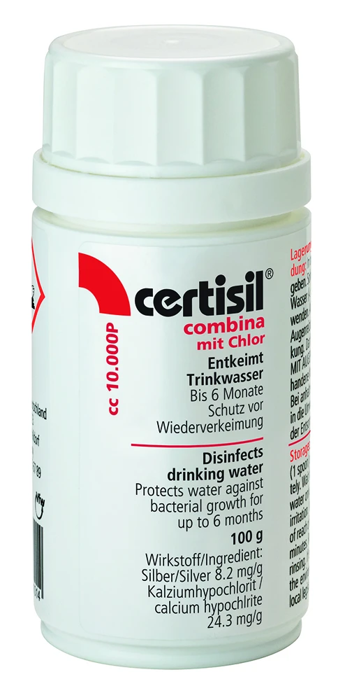 Katadyn Certisil Combina 10 000 P -je rozpustný prášek pro rychlou dezinfekci a konzervaci pitné vody. Eliminuje bakterie, viry a většinu prvoků do 30 minut, prvoky Lamblie (Giardia Intestinalis) do 120 minut a konzervuje pitnou vodu na 6 měsíců.