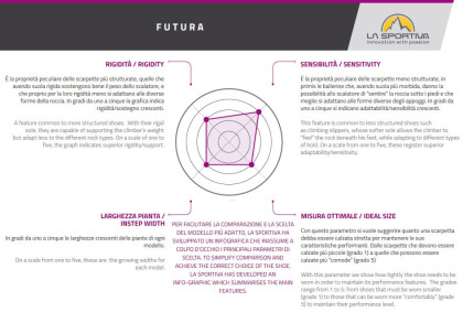 Lezečka La Sportiva Futura: je sportovní lezečka se špičkou s technologií NoEdge. Konstrukce špičky bez hrany umožňuje vysokou citlivost na prstech a výbornou přilnavost i na velice oblých a uklouzaných stupech. Pata se systémem P3, který zajišťuje dokonalé přitažení paty v botě a udržuje prohnutí lezeček. Výborná volba pro lezení těžkých cest. Snadno se vyzouvá a nazouvá, dotažení zajišťuje pásek na nártu s jednou velcro přezkou. Model vhodný pro technicky pokročilé lezce.