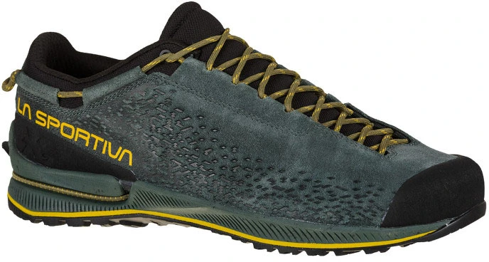La Sportiva TX2 Evo Leather Men – jsou hodně lehké, pánské boty určené pro nástupy ke skalám a ferratám. Jejich konstrukce vychází z lezeček. Na špičce podrážky je guma s nižší tuhostí a vyšší přilnavostí, která vám zvýší tření a tedy i jistotu při lezení na nástupu. Tvar je podobný lezačkám a směřuje vysokou citlivost do špičky. Tkaničky jsou až do přední části pro co nejlepší dotažení.