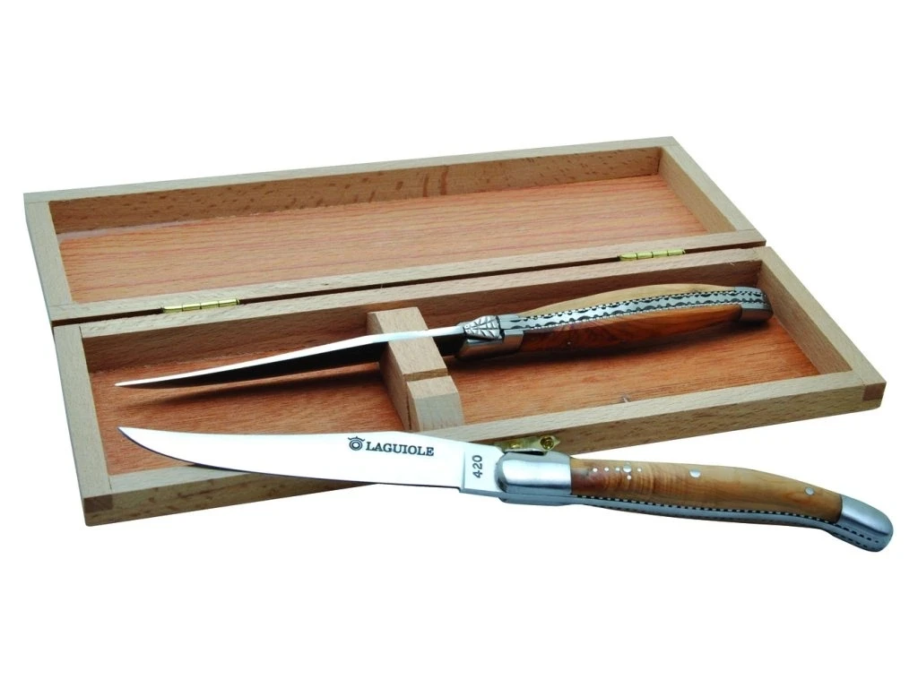 Laguiole DUB127 - exkluzivní sada 2 Laguiole steakových nožů s rukojetí z jalovcového dřeva.