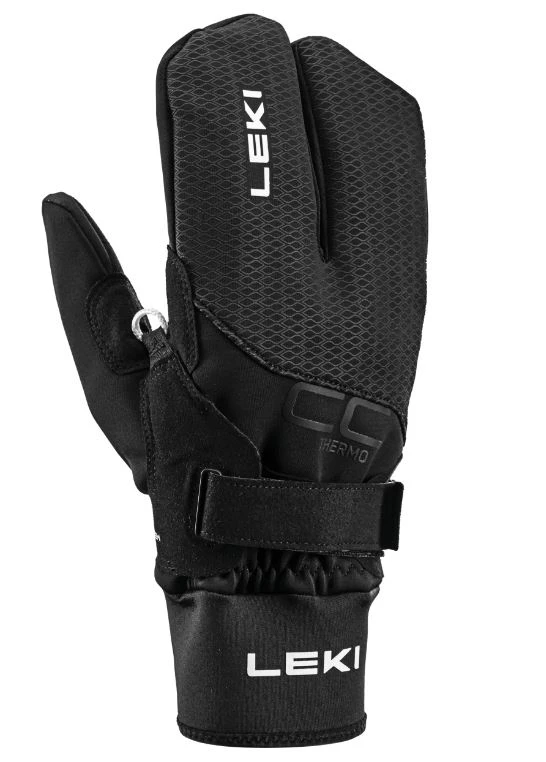 Rukavice na běžky Leki CC Thermo Shark Lobster – s poutkem mezi ukazovákem a palcem pro připnutí hůlek Leki se systémem Shark. Mají utahování pomocí jednoho suchého zipu.