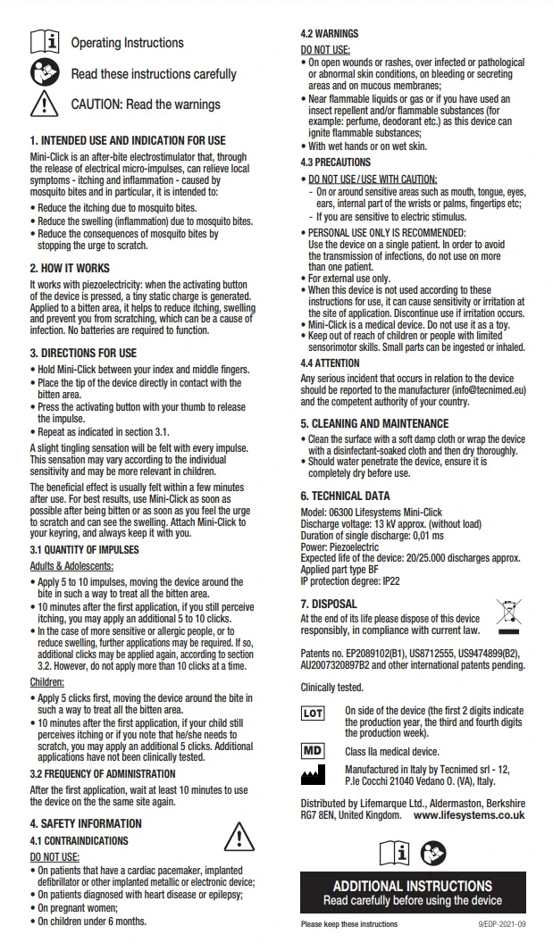 Lifesystems Mini Bite Relief Click: Zařízení využívající piezoelektrického pulzu, pro zklidnění při kousnutí hmyzem. Funguje na principu zastavení vyplavování histaminu pomocí piezoelektrického výboje (o nízkém proudu kolem 13 kV), který je generován z přírodního křemene krystalu. Pomáhá neutralizovat toxicitu kousnutí hmyzem, bez škodlivého účinku na okolní kůži. Tím zastaví nepříjemné svědění, a následně sníží otok štípnutí. Každé zařízení dokáže ošetřit až 5 000 štípnutí.