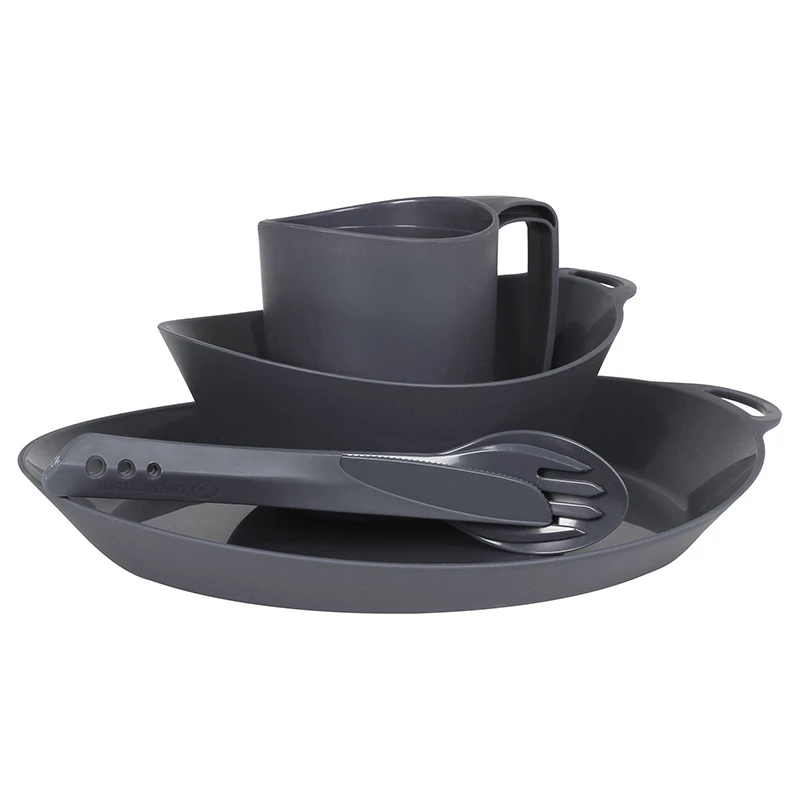 Lifeventure Ellipse 4-Piece Set: outdoorová jídelní sada pro jednu osobu. Obsahuje talíř, misku, hrnek a příbor. Nádobí je vyrobeno z lehkého a odolného plastu. Různé barvy.
