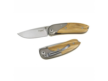 Mini je vybaven rukojetí se střenkami ze dřeva santos/olivového dřeva. Dřevo - tradiční materiál, který stále patří mezi nejpoužívanější na výrobu rukojetí nožů. Dřevěná rukojeť dodává noži přirozený a elegantní vzhled, rukojeti ze dřeva jsou příjemné na dotek. Nejpoužívanější typy dřeva jsou například buk (Opinel), bříza (skandinávské nože), dub, oliva, ořech, případně exotická dřeva jako bubinga, bocote, cocobolo nebo palisandr. Největší nevýhodou dřeva je náchylnost vůči vlhkosti, která se však dá zmenšit napuštěním v oleji (např. lněný olej).
