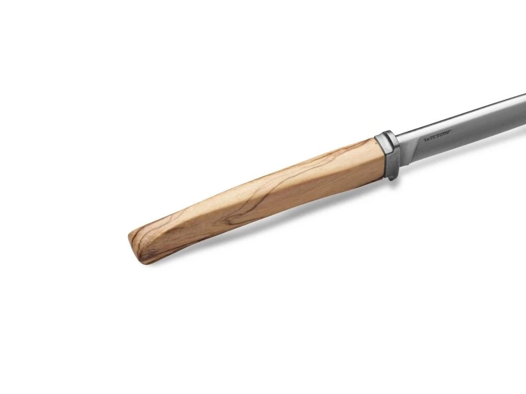 Rukojeť je u této verze vyrobena z jednoho kusu materiálu dřevo olivové. Dřevo - tradiční materiál, který stále patří mezi nejpoužívanější na výrobu rukojetí nožů. Dřevěná rukojeť dodává noži přirozený a elegantní vzhled, rukojeti ze dřeva jsou příjemné na dotek. Nejpoužívanější typy dřeva jsou například buk (Opinel), bříza (skandinávské nože), dub, oliva, ořech, případně exotická dřeva jako bubinga, bocote, cocobolo nebo palisandr. Největší nevýhodou dřeva je náchylnost vůči vlhkosti, která se však dá zmenšit napuštěním v oleji (např. lněný olej).