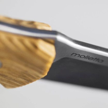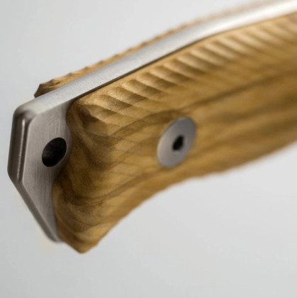 Rukojeť má jemné žebrování, jež omezuje nebezpečí proklouznutí v dlani, v této verzi je rukojeť vyrobena z olivového dřeva. Dřevo - tradiční materiál, který stále patří mezi nejpoužívanější na výrobu rukojetí nožů. Dřevěná rukojeť dodává noži přirozený a elegantní vzhled, rukojeti ze dřeva jsou příjemné na dotek. Nejpoužívanější typy dřeva jsou například buk (Opinel), bříza (skandinávské nože), dub, oliva, ořech, případně exotická dřeva jako bubinga, bocote, cocobolo nebo palisandr. Největší nevýhodou dřeva je náchylnost vůči vlhkosti, která se však dá zmenšit napuštěním v oleji (např. lněný olej).