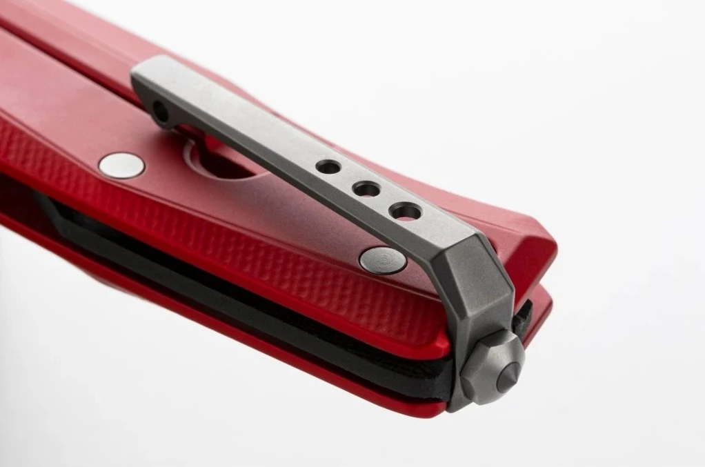 Rukojeť je vyrobena z rudě eloxovaného hliníku, titanový klip SOLID® je k titanové vložce (spacer) přišroubovaný pomocí wolfram-karbidového hrotu rozbíječe skla.