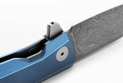 Je vybaven čepelí z exkluzivní damaškové ocele od výrobce Chad Nichols s dezénem "raindrops" (dešťové kapky), která je vybavena systémem "ReF" (Removable Flipper System) a kuličkovým ložiskovým systémem Double Crown, který udržuje čepel stabilnější a zajišťuje plynulejší pohyb. Damašková ocel je moderní kompozitní materiál, který vzniká svařováním dvou nebo více ocelí s rozdílným obsahem uhlíku do jednoho celku, čímž vzniká unikátní vrstvená struktura s charakteristickým vzorem a s kombinací tvrdosti a houževnatosti. Tento materiál je ceněný pro své výborné ostří, odolnost a estetickou kvalitu a používá se k výrobě nožů, zbraní, šperků a dalších předmětů. Tradiční damašková ocel (wootz) je odlišná, protože její výrobní tajemství je dnes ztraceno. Chad Nichols je renomovaný americký nožíř a výrobce damaškové oceli, známý svou výrobou vysoce kvalitní nerezové a uhlíkové damaškové oceli, mozaikové damaškové oceli, Moku-Ti, Zirku-Ti a Mokume. Jeho produkty jsou vyráběny v USA a jsou ceněny pro svou kvalitu a estetiku.