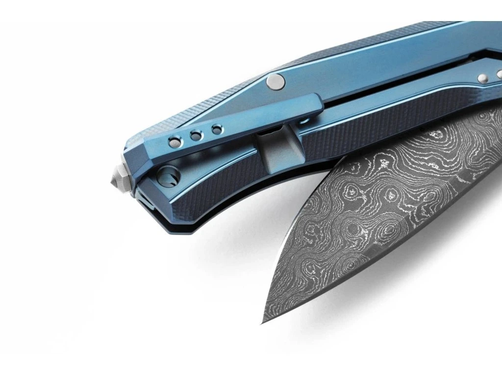 Je vybaven čepelí z exkluzivní damaškové ocele od výrobce Chad Nichols s dezénem "raindrops" (dešťové kapky), která je vybavena systémem "ReF" (Removable Flipper System) a kuličkovým ložiskovým systémem Double Crown, který udržuje čepel stabilnější a zajišťuje plynulejší pohyb. Damašková ocel je moderní kompozitní materiál, který vzniká svařováním dvou nebo více ocelí s rozdílným obsahem uhlíku do jednoho celku, čímž vzniká unikátní vrstvená struktura s charakteristickým vzorem a s kombinací tvrdosti a houževnatosti. Tento materiál je ceněný pro své výborné ostří, odolnost a estetickou kvalitu a používá se k výrobě nožů, zbraní, šperků a dalších předmětů. Tradiční damašková ocel (wootz) je odlišná, protože její výrobní tajemství je dnes ztraceno. Chad Nichols je renomovaný americký nožíř a výrobce damaškové oceli, známý svou výrobou vysoce kvalitní nerezové a uhlíkové damaškové oceli, mozaikové damaškové oceli, Moku-Ti, Zirku-Ti a Mokume. Jeho produkty jsou vyráběny v USA a jsou ceněny pro svou kvalitu a estetiku.